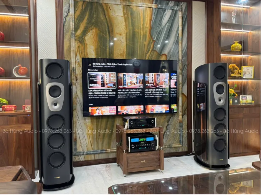 – Thùng loa được chế tác từ nhiều lớp gỗ ép, sử dụng máy CNC 5 trục để gia công các chi tiết với độ dày lên đến 81mm, giúp kiểm soát cộng hưởng và tăng độ cứng cáp.